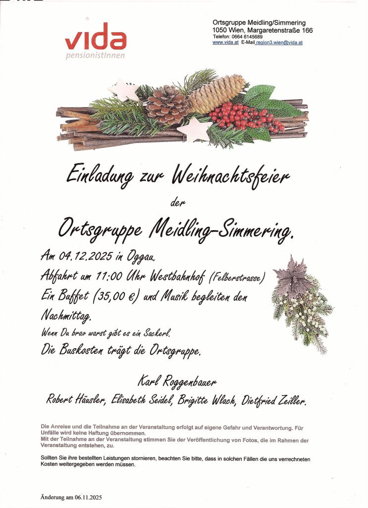 Die vida-Ortsgruppe Meidling/Simmering lädt am 4. Dezember 2025 zur Weihnachtsfeier nach Oggau ein.