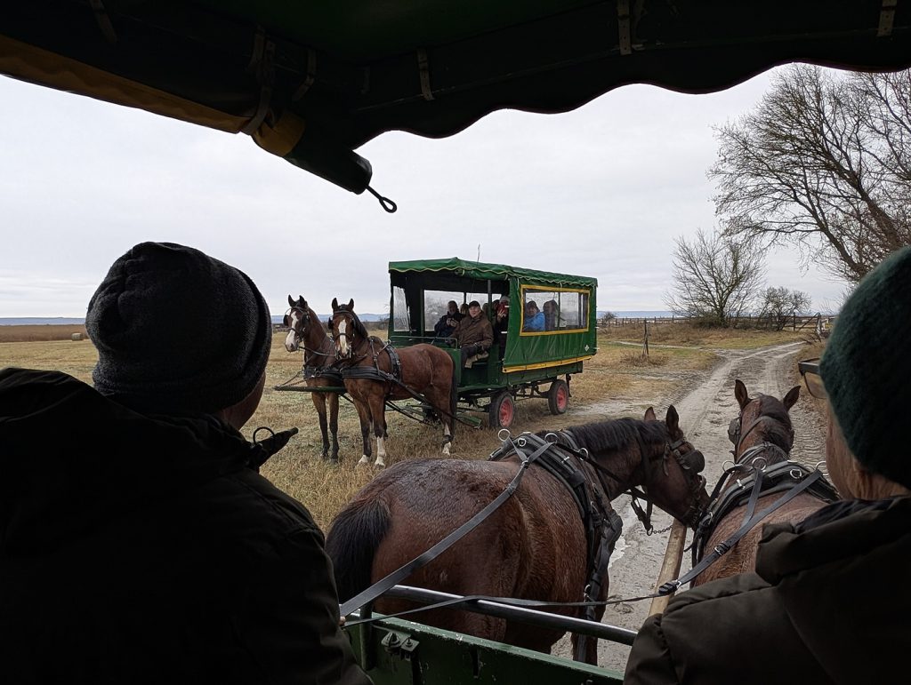Nach einer Stärkung in Neusiedl am See fuhren wir bei strömenden Regen nach Ilmitz, wo schon zwei bespannte Pferdekutschen der Familie Gangl auf uns warteten.