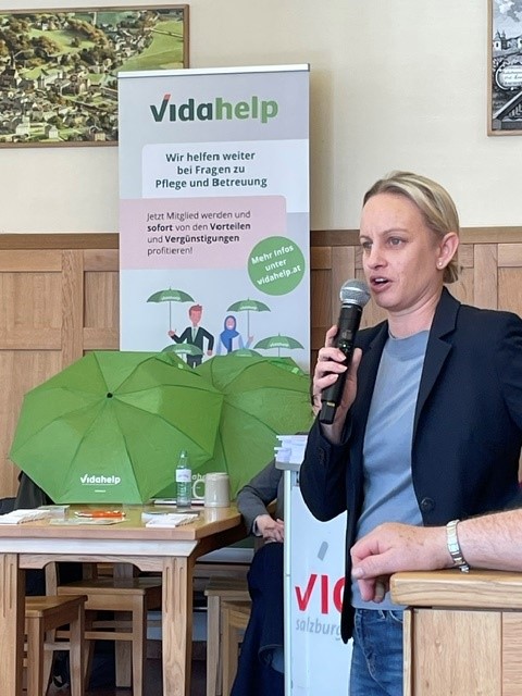 Zahlreiche Gäste und Expert:innen waren vor Ort – unter anderem Michaela Schmidt, Staatssekretärin im Bundesministerium für Wohnen, Kunst, Kultur, Medien und Sport, Friedrich Schinagl, Landesvorsitzender vida Salzburg, Antigona Rama, Landesdirektorin der ÖBV in Salzburg, Gerhard Gallo, Landesvorsitzender vida-Pensionist:innen Salzburg, Yvonne Heuber, Geschäftsführerin von vidahelp, und Josef Wiesinger, Bundesvorsitzender der vida-Pensionist:innen.
