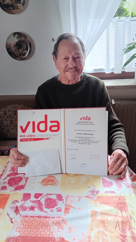 Die vida-Ortsgruppe Wiener Neustadt gratuliert Johann Steiberger zum 80. Geburtstag.